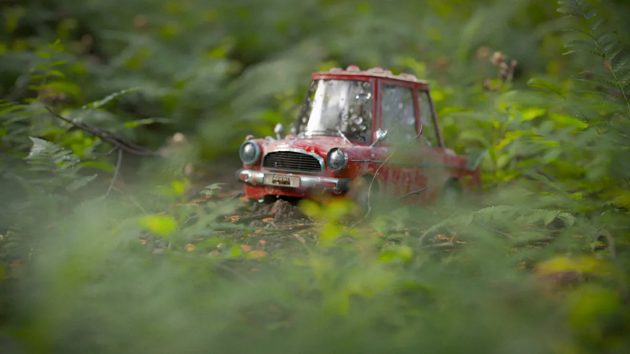 The captivating scene showcases a meticulously detailed miniature car model adorned with water droplets, set amidst a lush forest backdrop.
