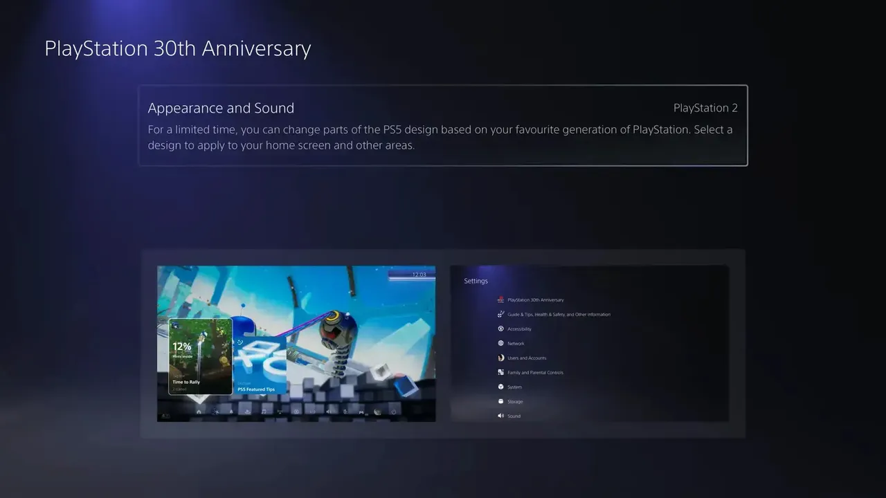 PS5 players will now be greeted with the iconic Sony Computer Entertainment boot screen from the PS1, complete with its equally as legendary sound. Once on the home screen, players can access the settings menu to choose between the PS1, PS2, PS3, PS4, PS5, or 30th Anniversary themes, each with their own set of visuals and sound effects.
